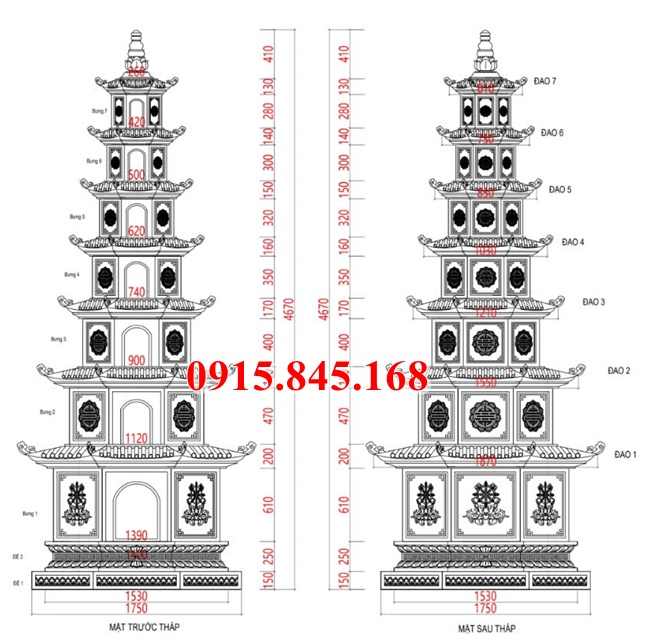 Phần đế là phần có kích thước lớn nhất tính theo đường kính bạn có thể lựa chọn một trong các kích thước hợp phong thủy như 255cm, 305cm hoặc 329cm. Sau đến phần để bát hương rồi các tầng tháp sẽ nhỏ dần lên trên.