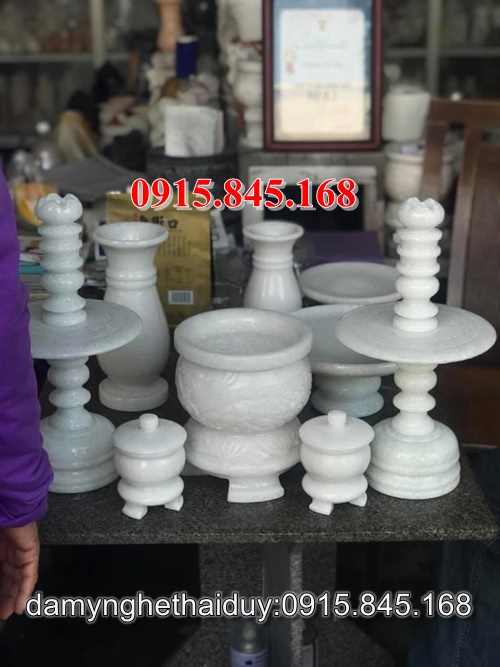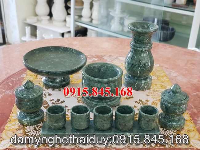 Bộ bát hương thờ gia tiên bao gồm bát hương cắm nhang, chân đèn bàn thờ, bình hoa đá và dĩa đá. Bên trên bát Hương có thể được chạm khắc họa tiết Song Long Chầu Nguyệt dịu mắt. Sản phẩm thường được sản xuất với kích thước lớn nhỏ khác nhau để phù hợp với từng kích cỡ bàn thờ.