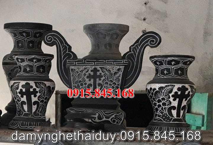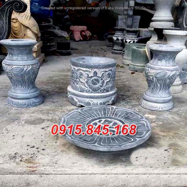 Bộ bát hương thờ gia tiên bao gồm bát hương cắm nhang, chân đèn bàn thờ, bình hoa đá và dĩa đá. Bên trên bát Hương có thể được chạm khắc họa tiết Song Long Chầu Nguyệt dịu mắt. Sản phẩm thường được sản xuất với kích thước lớn nhỏ khác nhau để phù hợp với từng kích cỡ bàn thờ.
