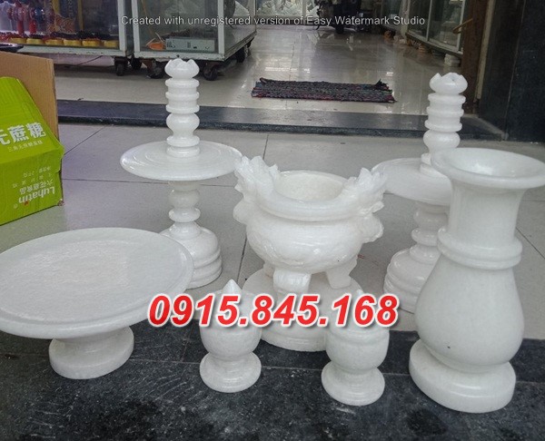 Bộ bát hương thờ gia tiên bao gồm bát hương cắm nhang, chân đèn bàn thờ, bình hoa đá và dĩa đá. Bên trên bát Hương có thể được chạm khắc họa tiết Song Long Chầu Nguyệt dịu mắt. Sản phẩm thường được sản xuất với kích thước lớn nhỏ khác nhau để phù hợp với từng kích cỡ bàn thờ.
