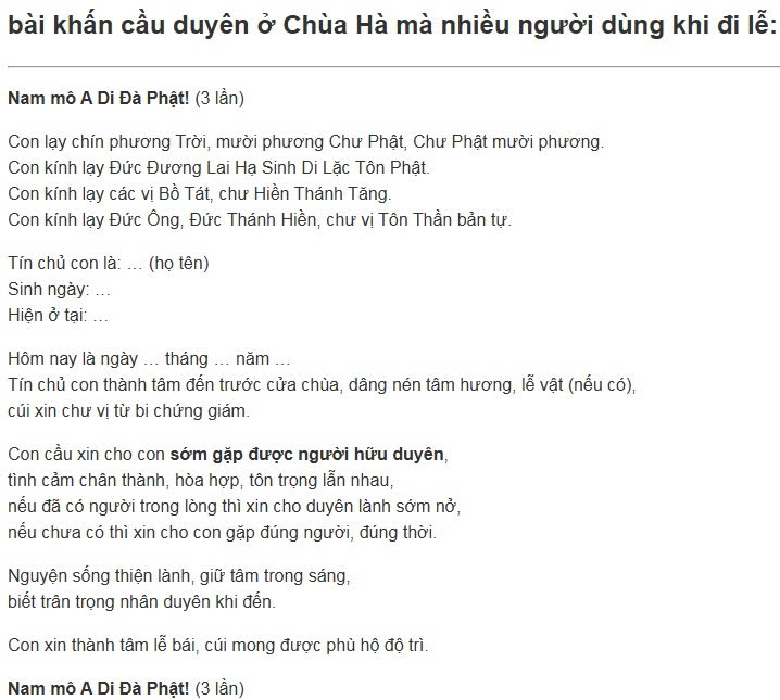 bài khấn cầu duyên ở Chùa Hà mà nhiều người dùng khi đi lễ:
