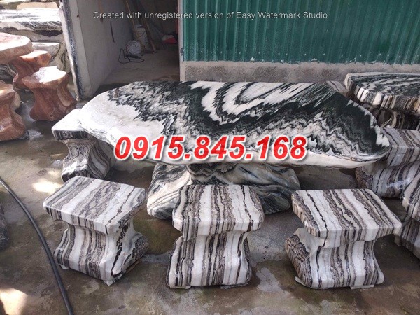 Sản phẩm bàn đá vân gỗ tự nhiên với kích thước 138cm x 100cm x 58cm có thể được sắp xếp theo yêu cầu của khách hàng. Mỗi bộ sản phẩm gồm 1 bàn và 8 ghế đôn,