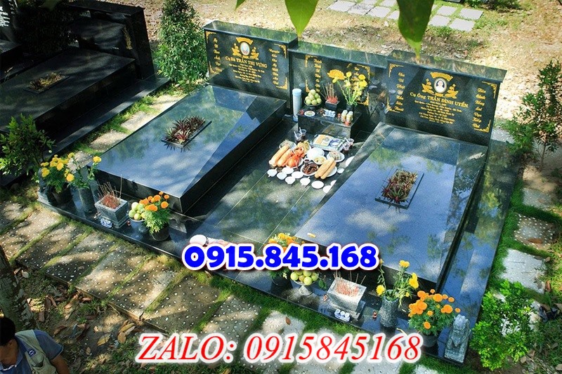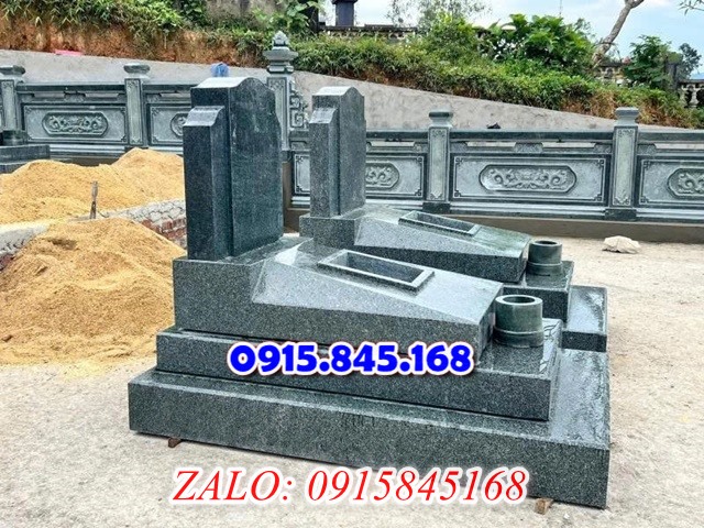 kích thước phong thủy. Mẫu mộ được làm từ chất liệu đá xanh rêu với thiết kế hiện đại khác nhau như: khu lăng mộ, lăng thờ chung, nghĩa trang gia đình dòng họ, mộ đôi, mộ tròn, mộ tháp, mộ tam cấp, mộ công giáo, mộ hai ba mái, mộ không mái.
