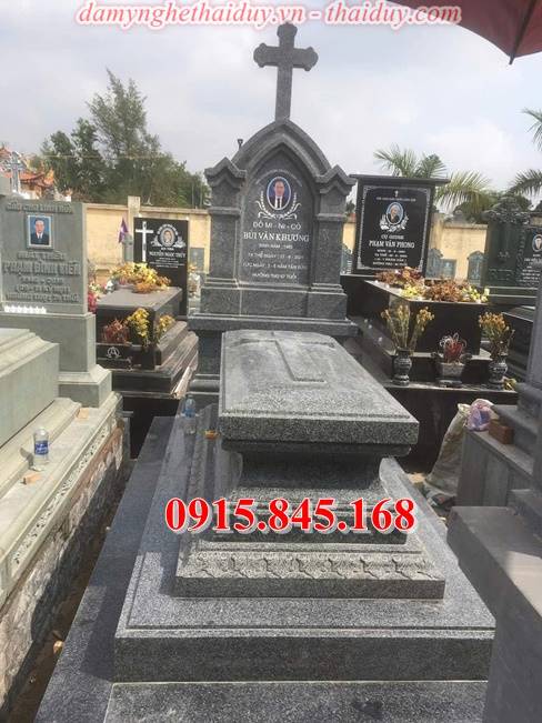 Mộ đá công giáo được thiết kế dành riêng cho những người theo Đạo Thiên Chúa. Hoa văn và kiểu dáng khắc trên mộ là đặc trưng của Đạo giáo. Đặc biệt, cây thánh giá được đặt ở vị trí cao nhất, trang trọng nhất. Người ta thường chọn đá hoa cương, đá xanh rêu hay xanh đen để đảm bảo chất lượng của công trình.