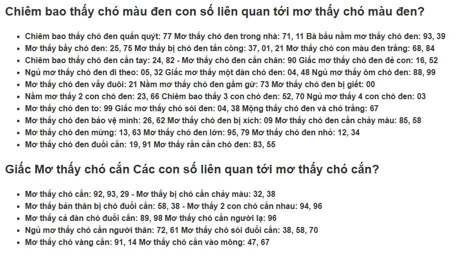 - Chiêm bao thấy chó đen cắn tay: 24, 82 – Mơ thấy chó đen cắn chân: 90 Giấc mơ thấy chó đen đẻ con: 16, 52