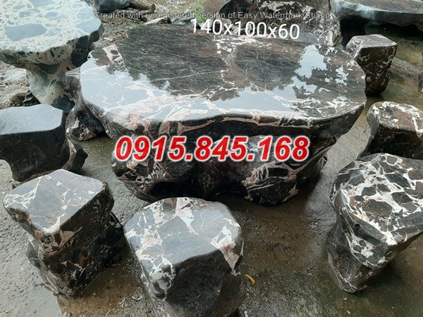 Sản phẩm bàn đá vân gỗ tự nhiên với kích thước 138cm x 100cm x 58cm có thể được sắp xếp theo yêu cầu của khách hàng. Mỗi bộ sản phẩm gồm 1 bàn và 8 ghế đôn,