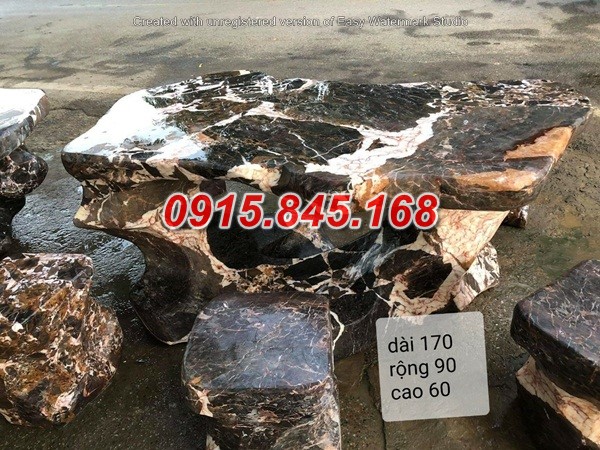 Sản phẩm bàn đá vân gỗ tự nhiên với kích thước 138cm x 100cm x 58cm có thể được sắp xếp theo yêu cầu của khách hàng. Mỗi bộ sản phẩm gồm 1 bàn và 8 ghế đôn,