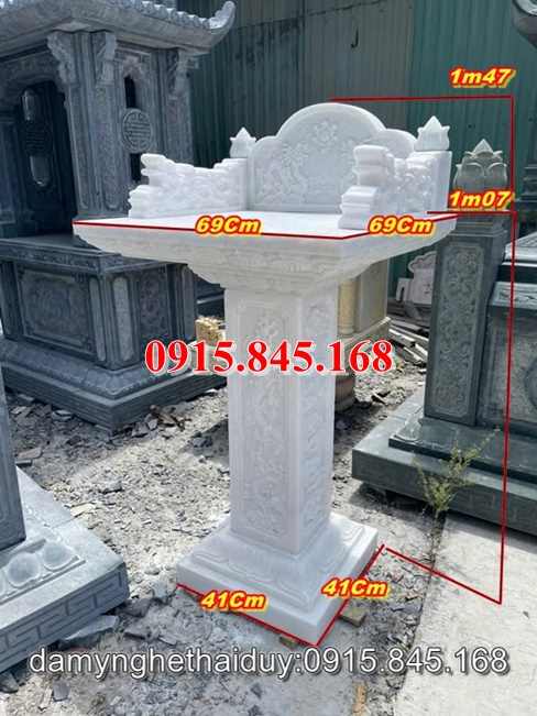 Mẫu cây hương ngoài trời bằng đá có mái che được làm với kích thước, vuông 69 cm, vuông 81 cm, vuông 89cm, với những cây hương ngoài trời lắp đặt tại công ty, xí nghiệp, sẽ có kích thước mặt bàn vuông lớn hơn như: 1m07, 1m27, 1m33, 1m44, 1m55, 1m67,…